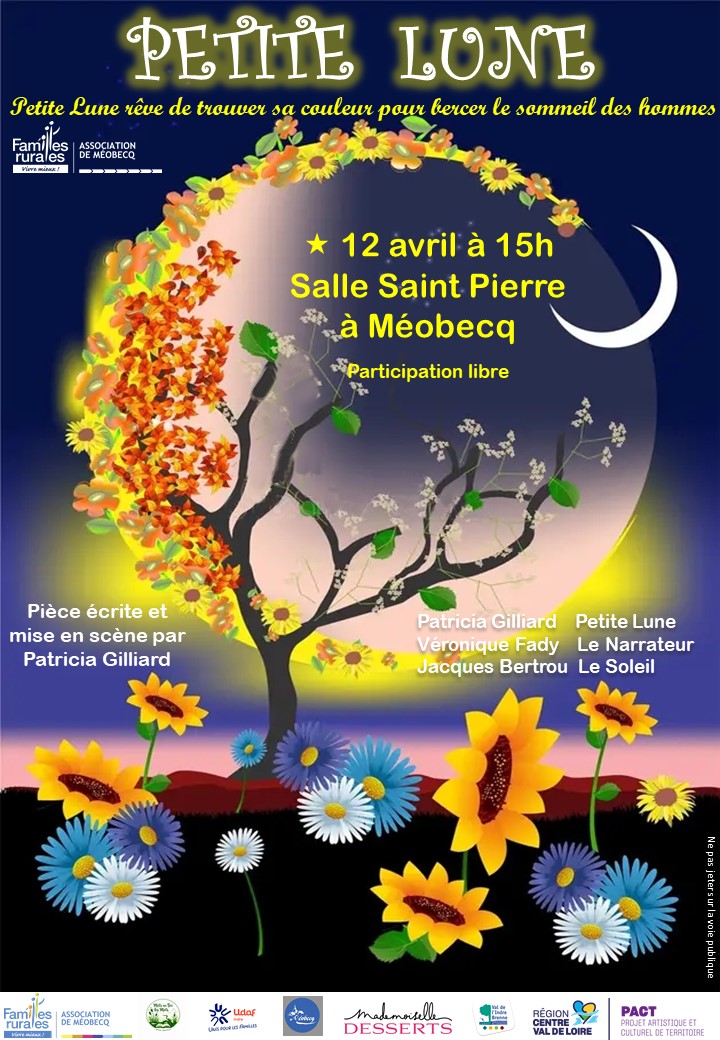 L'association Familles Rurales de Méobecq et Mets au Bec les Mots sont heureux de vous présenter une création de Patricia Gilliard qui a écrit, mis en scène cette jolie pièce pleine de poésie.